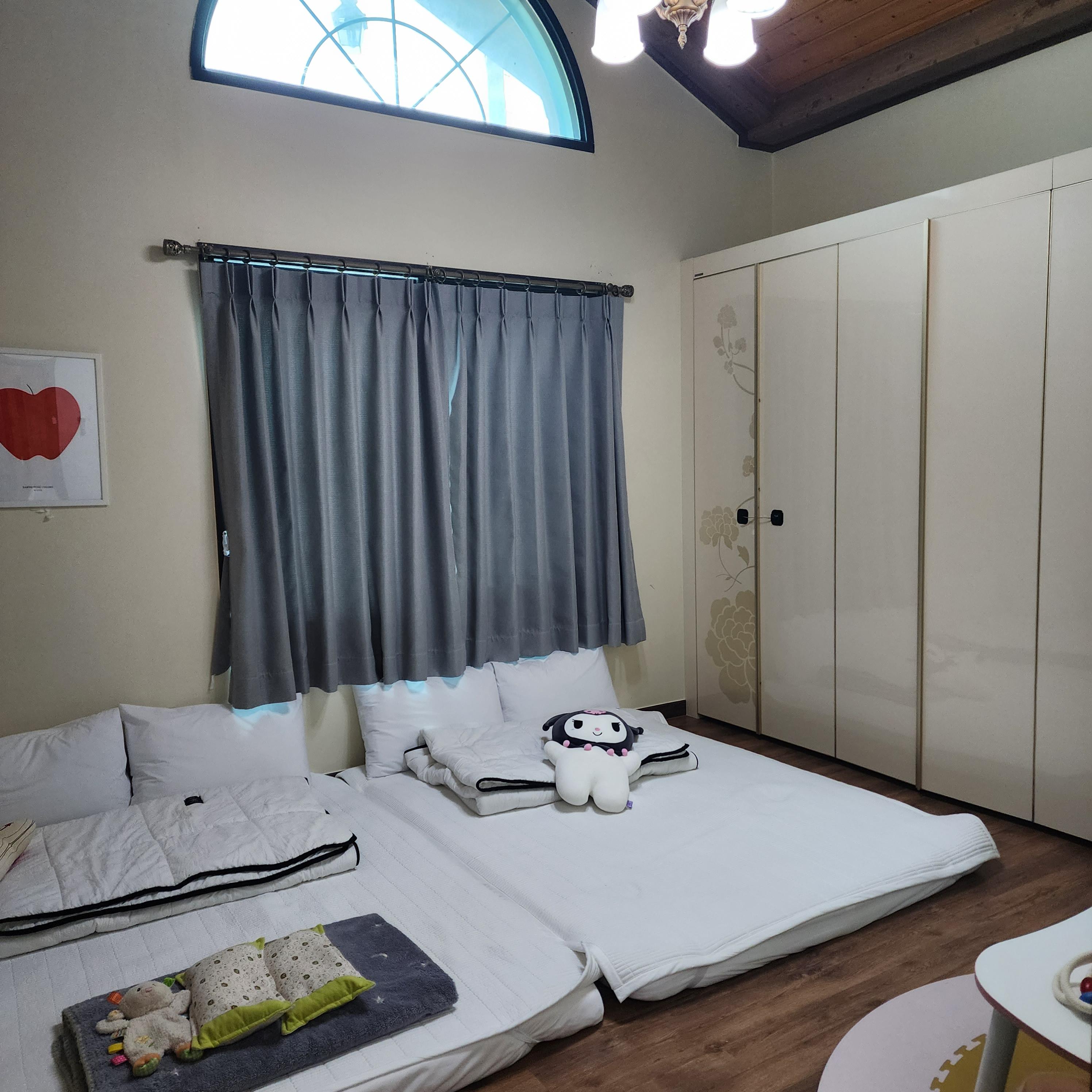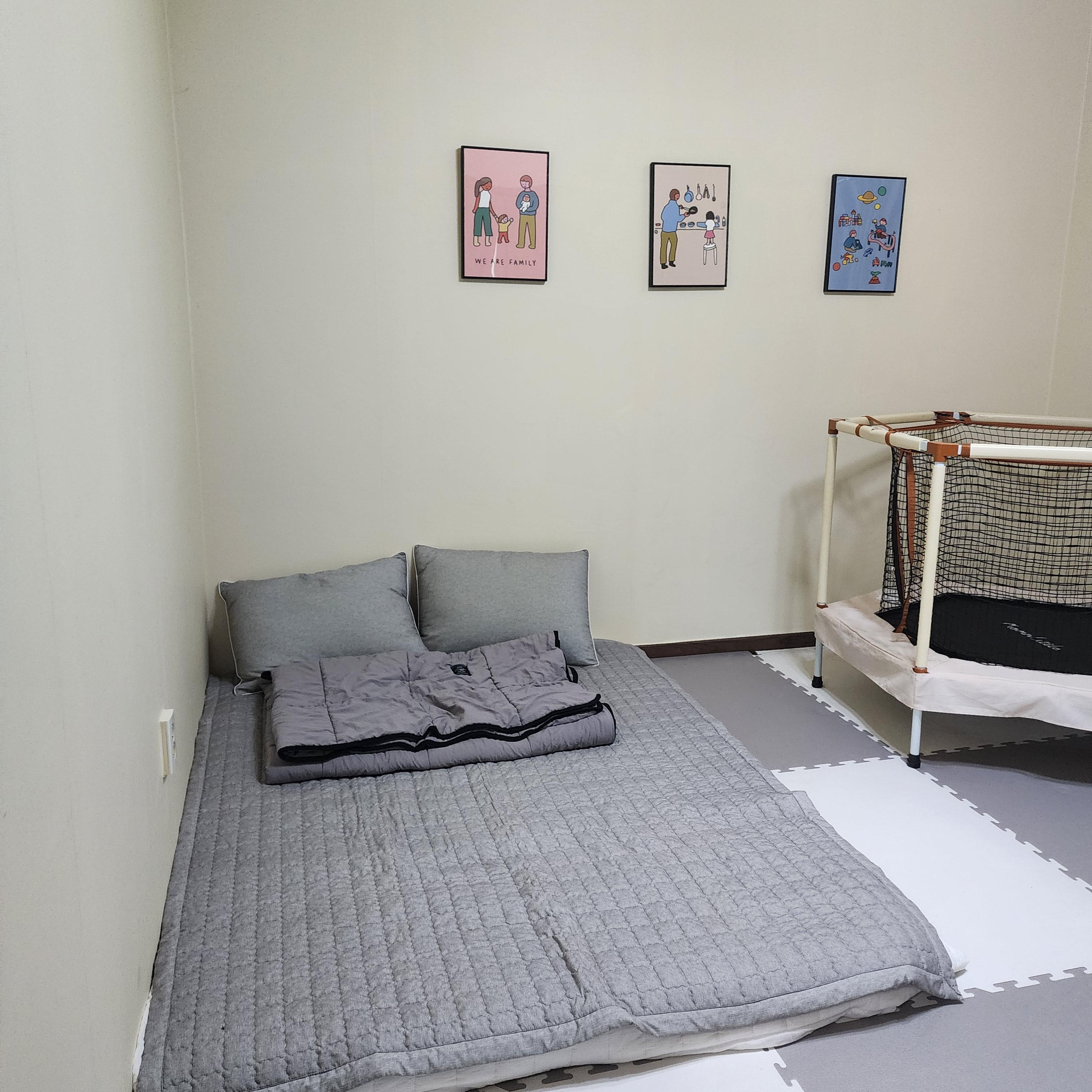 방 1개는 패밀리매트가 깔려 있고요. 나머지 방 1개는 2인용 매트가 깔려 있어요~ 그리고 숙소 안에서도 놀 수 있게 유아용 놀이시설들이 마련되어 있습니다.