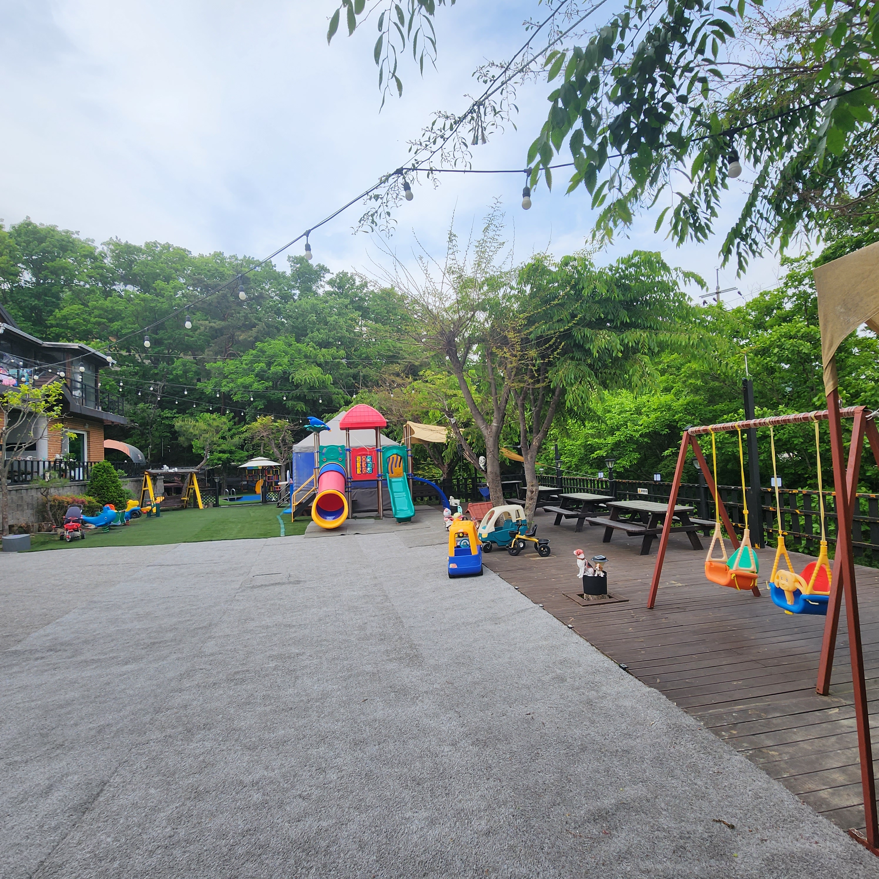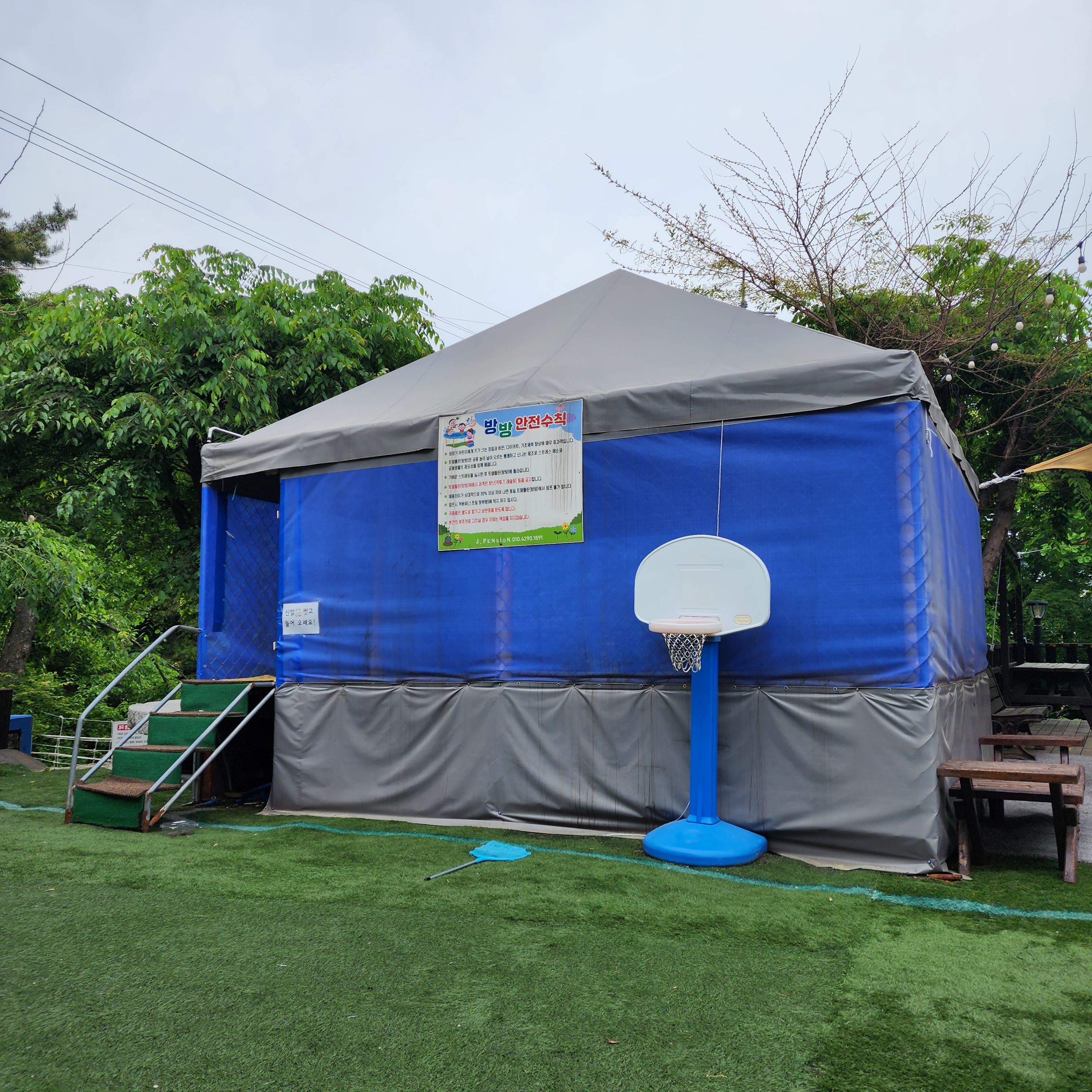 놀이시설은 대형 트램펄린, 그네, 모래놀이, 싱싱카, 자동차, 미끄럼틀, 정글짐 등이 있습니다.