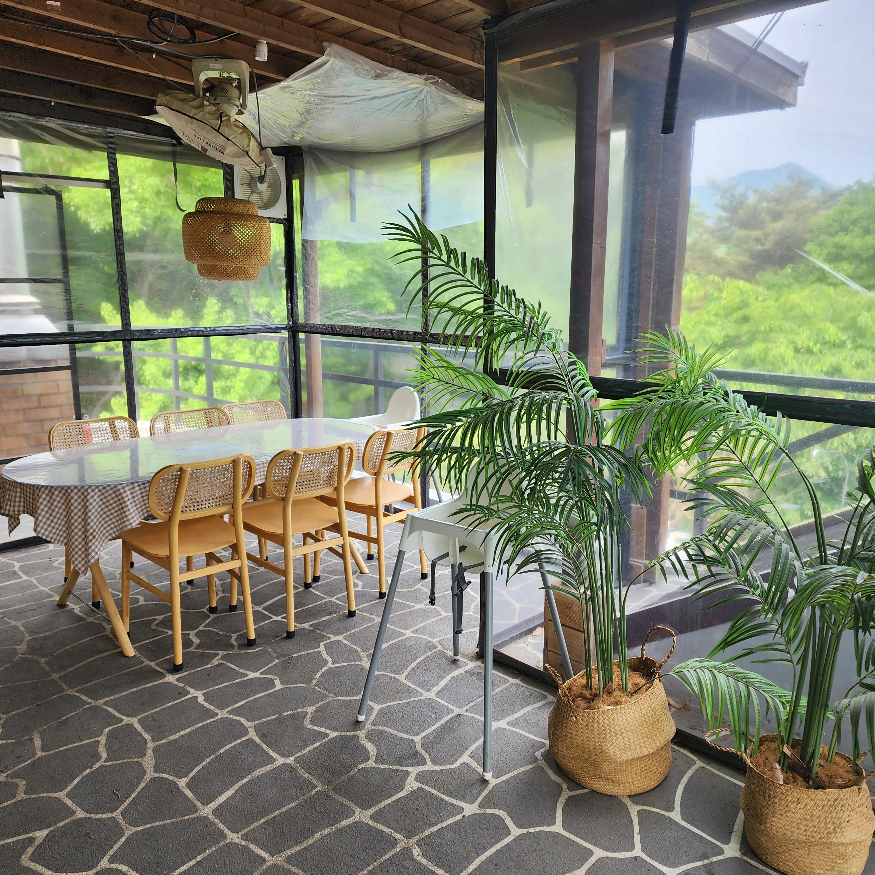 테라스는 보시는 것처럼 정말 이국적인 느낌으로 꾸며져 있어서 여기서 고기 구워 먹으니 정말 좋더라고요. 동남아 여행온 느낌 ㅎㅎ 바베큐 2만 원정도 내시면 불 피워주세요~