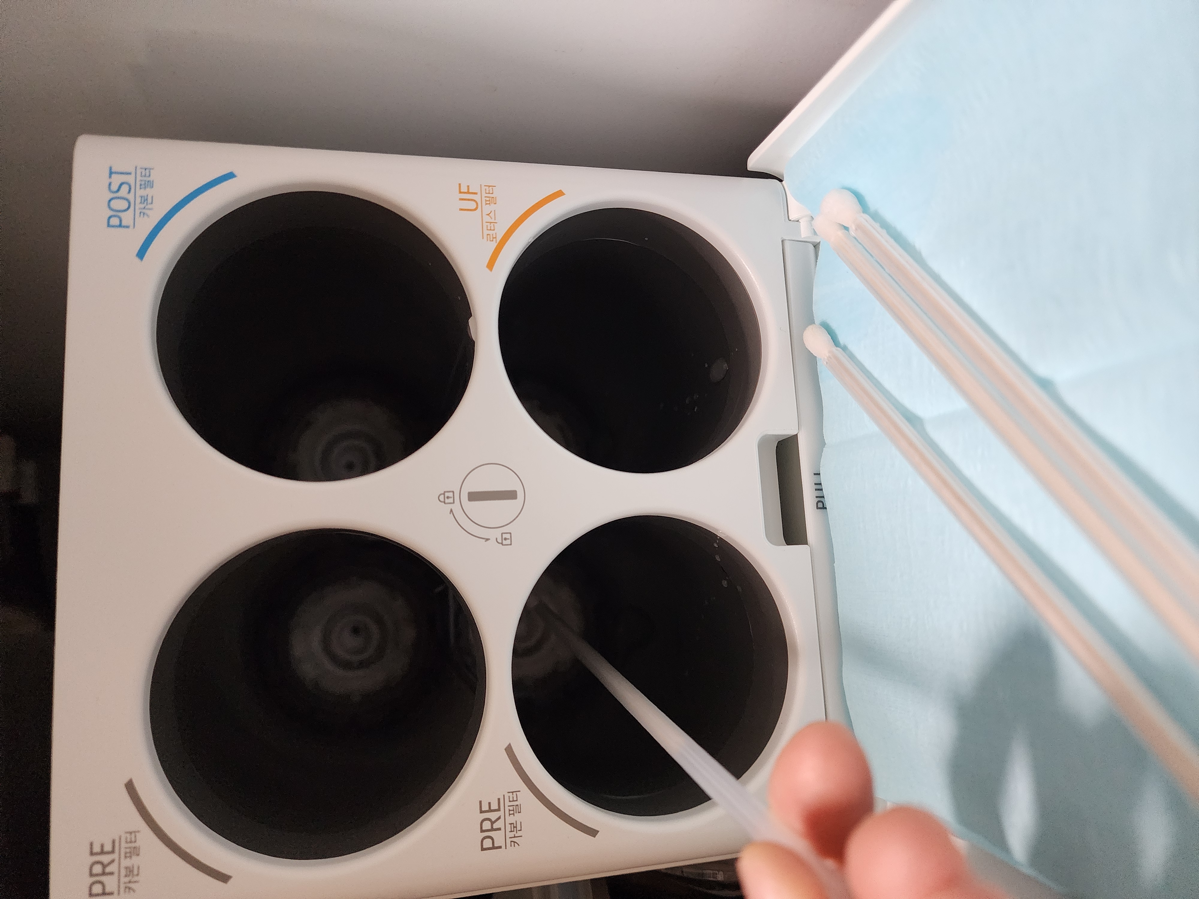 *필터 제거 후 면봉으로 안쪽 입구를 닦아줍니다.