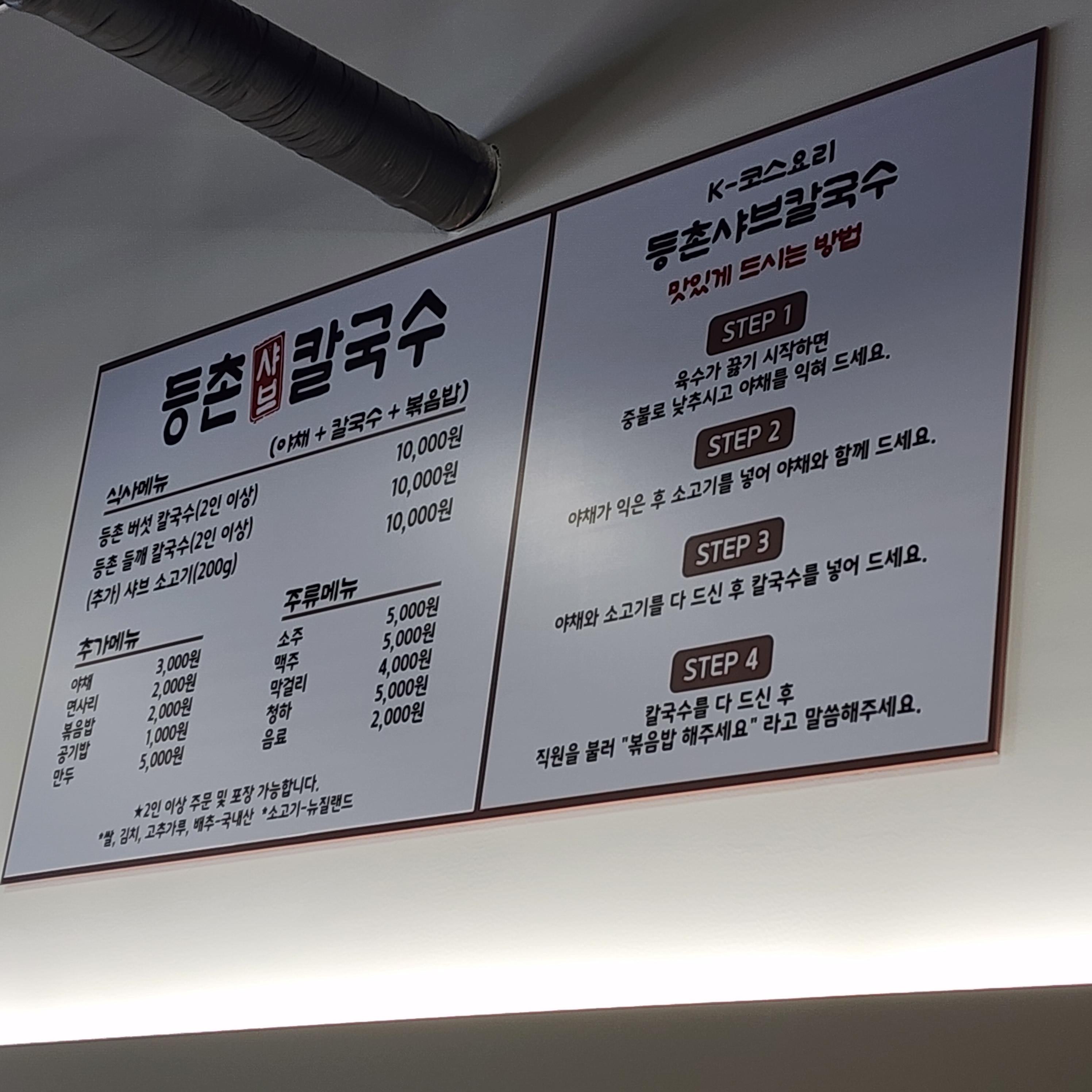 메뉴는 등촌샤브칼국수 얼큰한 국물 단일메뉴이고요.