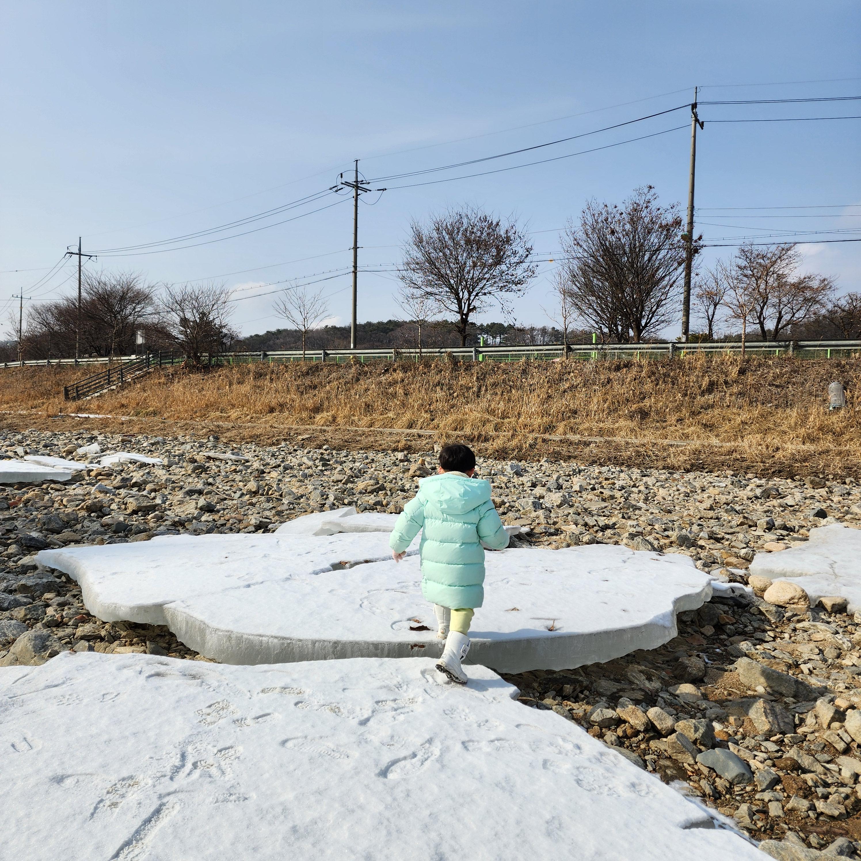 캠핑장 건너편에 바로 하천이라서 얼음이 잔뜩 얼어 있더라구요. 거기서 얼음썰매 탈 수 있어요.