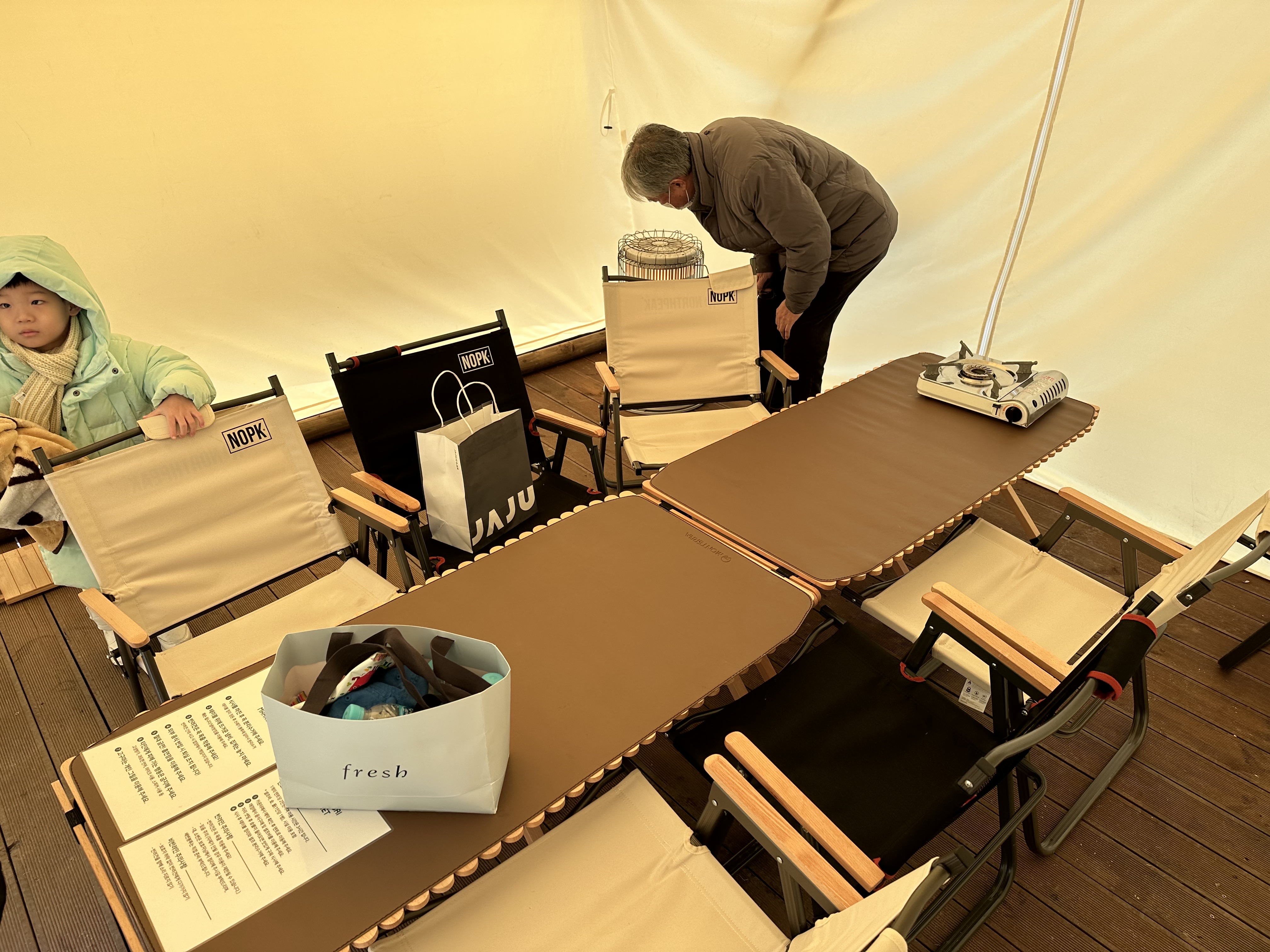 텐트 안에는 8인용 상과 의자가 세팅되어 있고, 따뜻한 난로가 준비되어 있습니다.