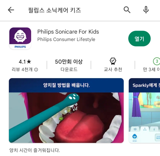 처음엔 간지럽다고 하더니 필립스 소닉케어 키즈 어플리케이션 틀어주니 그거 보면서 간지러운 것도 잊고 몇 번씩 양치를 합니다.