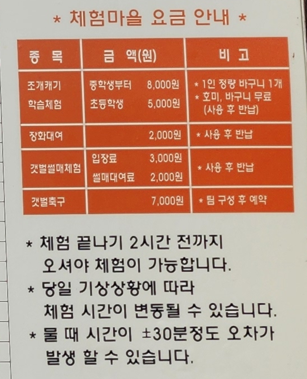 갯벌체험객을 위한 주차장은 마련되어 있지 않아서 빨간등대 쪽의 외부 공영주차장 아무데나 빈 곳에 대시고 주차요금 내야 합니다.