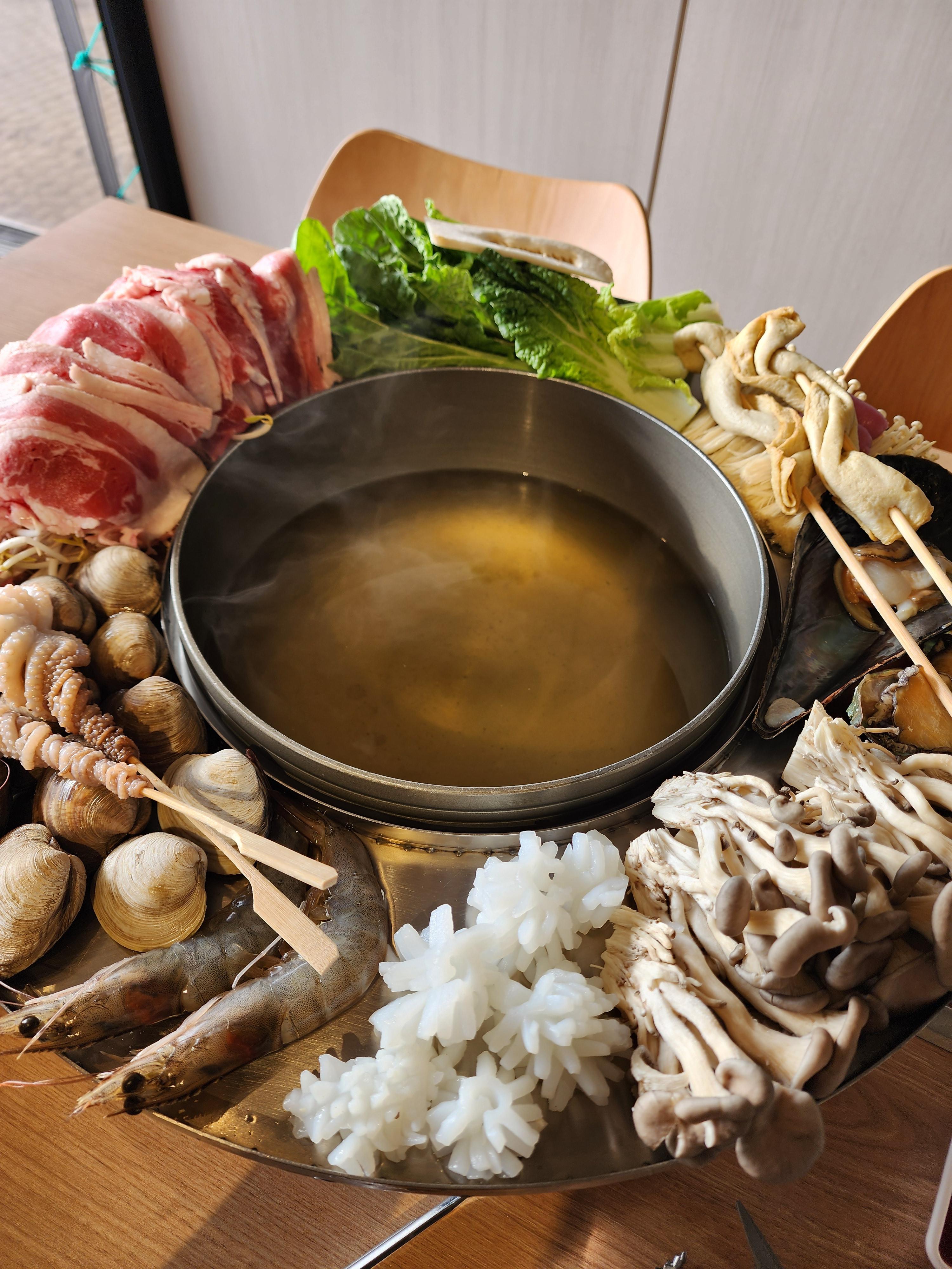 비주얼이 예쁘고 메인메뉴인 샤브샤브와 김치가 맛있었고 잘 먹었으나 메뉴판의 안내 해산물과 달리 싼 냉동해산물이 들어가 실망스러웠고, 그에 따른 안내가 없었다는 점..