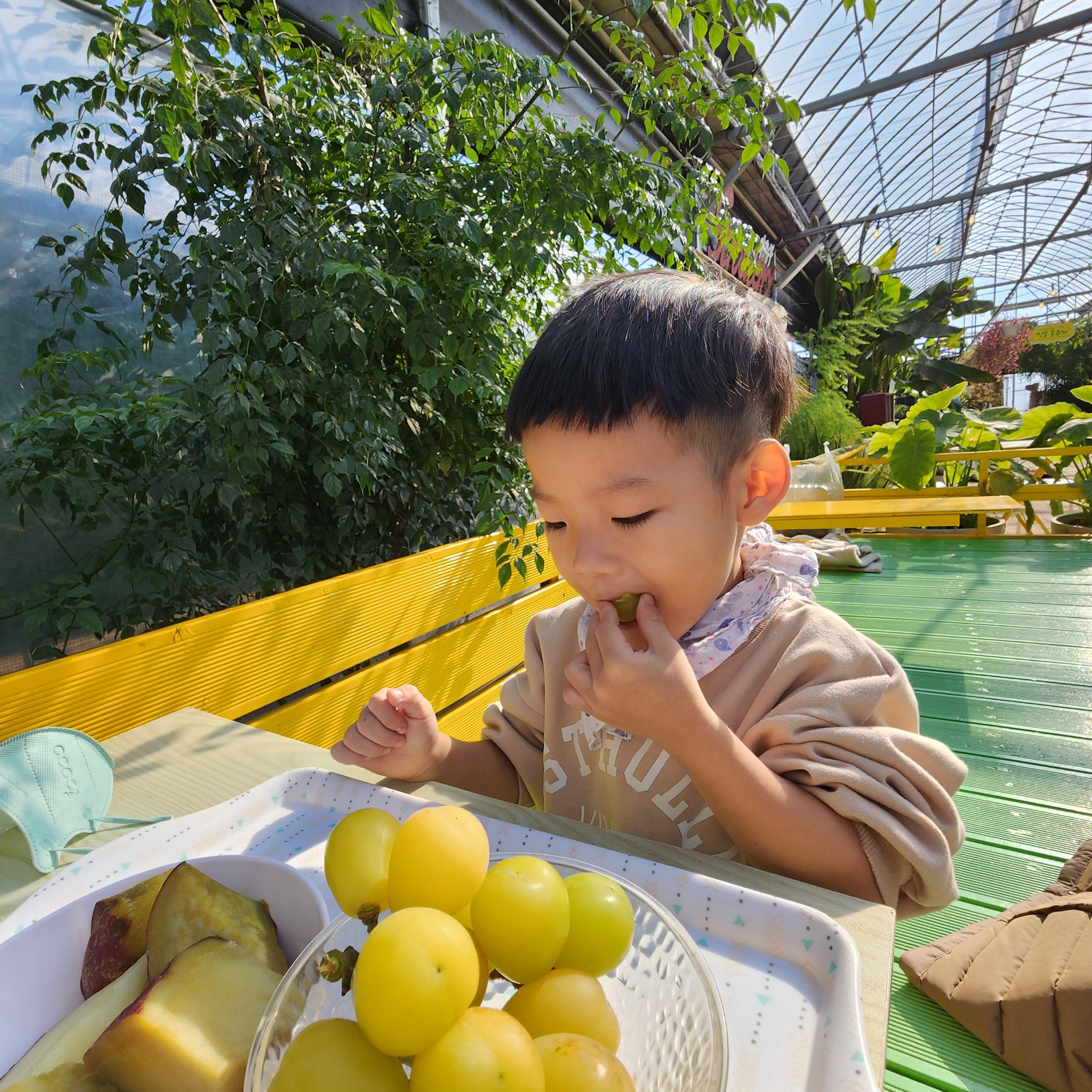 체험이 모두 끝나면 삶은 고구마와 씻은 포도를 접시에 시식용으로 담아주십니다. 비닐하우스 안에 미니테이블을 많이 해놓으셔서 거기 자리 잡고 앉아서 포도도 먹고 고구마도 먹으면 돼요~