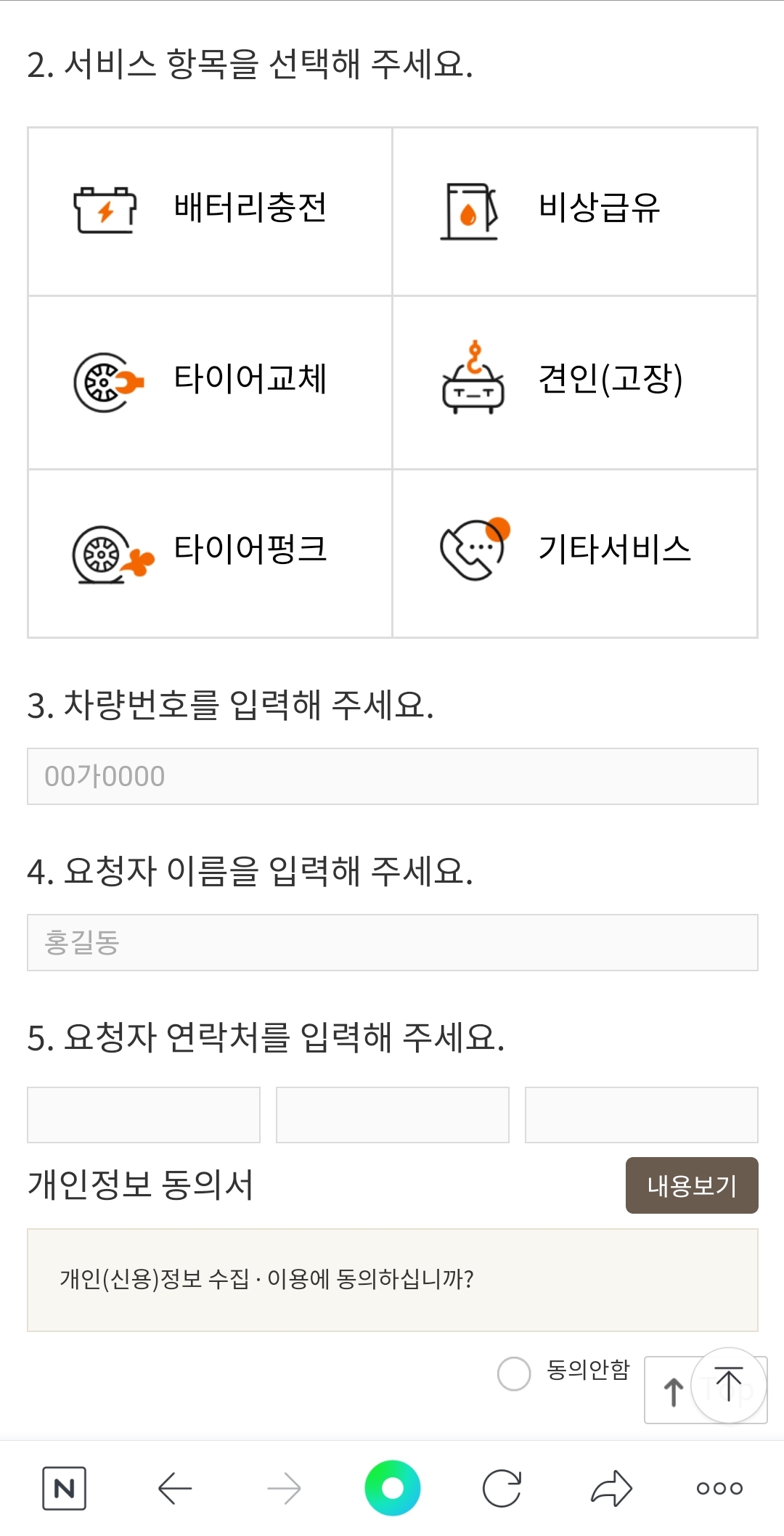 그냥 입력하라는 정보들인 어디에서 차에 문제가 생겼는지, 서비스 받고자 하는 건 무엇인지, 차번호, 전화전호 등등 간단히 입력하면 바로 서비스 요청이 됩니다.