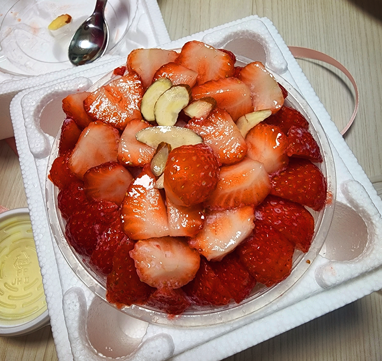 비교해보자면 첫 번째 소개해드렸던 맛있는 빙달은 딸기 알이 크고, 우유 빙수의 양이 엄청 많아요.