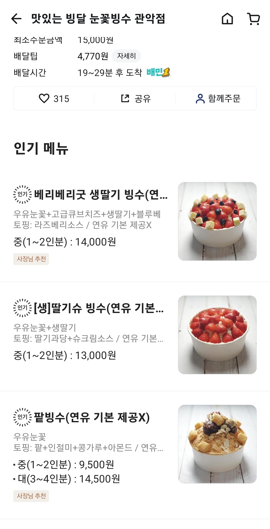 저희 동네는 검색해보니 두 군데에서 생딸기 빙수를 팔고 있었어요.